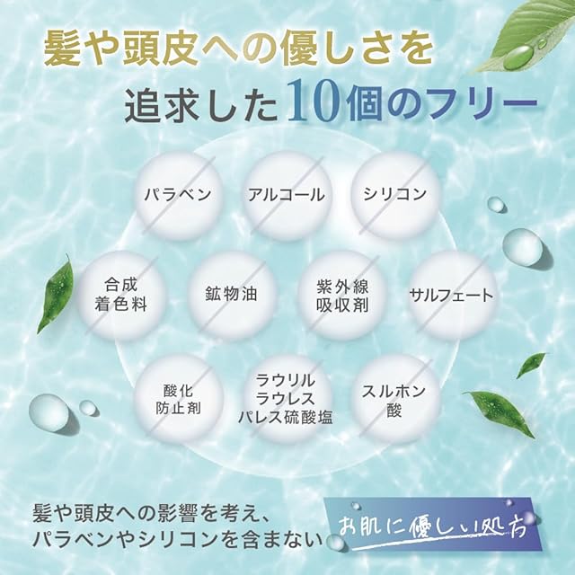 【頭皮に優しい無添加】サルフェートやシリコンなどを一切配合しない、お肌に優しい処方です。10個の添加物フリーで、低刺激で敏感肌の方にも優しく安全なMADE IN JAPANの商品です。