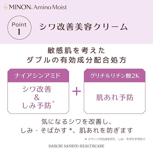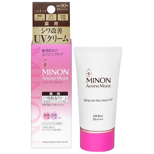【シワ改善・しみ予防*1をしながら紫外線カット】下地効果も備えた敏感肌向け多機能UVクリームです。敏感肌を考えた紫外線吸収剤フリー、酸化亜鉛フリー処方で最高*2UVカット「SPF50+、PA++++」も実現しました。エイジングケア:年齢に応じたお手入れ。*1 メラニンの生成を抑え、しみ・そばかすを防ぐ。*2 ミノン アミノモイスト シリーズ内
