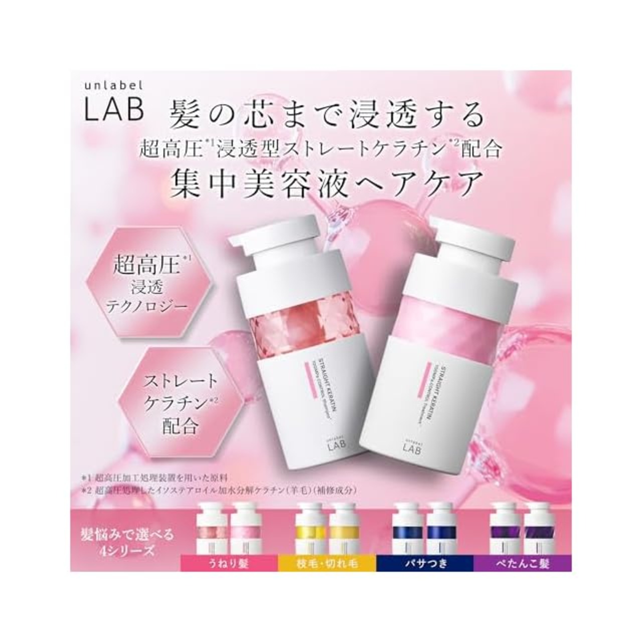 スキンケアで培われたアンレーベルの超高圧※1浸透テクノロジーで大人のうねり髪・ツヤ不足に集中アプローチ。 超高圧※1浸透型ストレートケラチン※2が大人のうねり・くせ・ツヤ不足な髪を濃密補修。流すたびきらめくまっすぐサラ髪に導く集中美容液トリートメント。 エレガントで清潔感のあるグリッターローズの香り。 ※1超高圧加工処理装置を用いた原料※2超高圧処理したイソステアロイル加水分解ケラチン(羊毛)(補修成分) 【ご使用方法】シャンプー後、軽く水気を切り、適量を毛先を中心になじませます。その後、しっかりすすいでください。 ※液が出にくいときは、容器下部を横から軽く叩いてください。 ★ポンプの開け方:ポンプ肩部を押さえながら頭部を反時計回りに回して上げ、数回空押ししてからご使用ください。頭部が上がらない時はポンプ肩部を固く締め直して手で固定し、頭部を再度回してください。 【使用上の注意】 ●お肌に異常が生じていないかよく注意して使用してください。 お肌に合わない時即ち次のような場合には、使用を中止してください。 そのまま使用を続けますと、症状を悪化させることがありますので、皮フ科専門医等にご相談されることをおすすめします。 (1)使用中、赤味、はれ、かゆみ、刺激、色抜け(白斑等)や黒ずみ等の異常があらわれた場合 (2)使用したお肌に、直接日光があたって前記のような異常があらわれた場合 ●傷やはれもの、湿しん等異常のある部位には使用しないでください。 ●目に入らないように注意し、入ったときはすぐに洗い流してください。 ●極端に高温又は低温、直射日光のあたる場所、乳幼児の手の届く場所には保管しないでください。