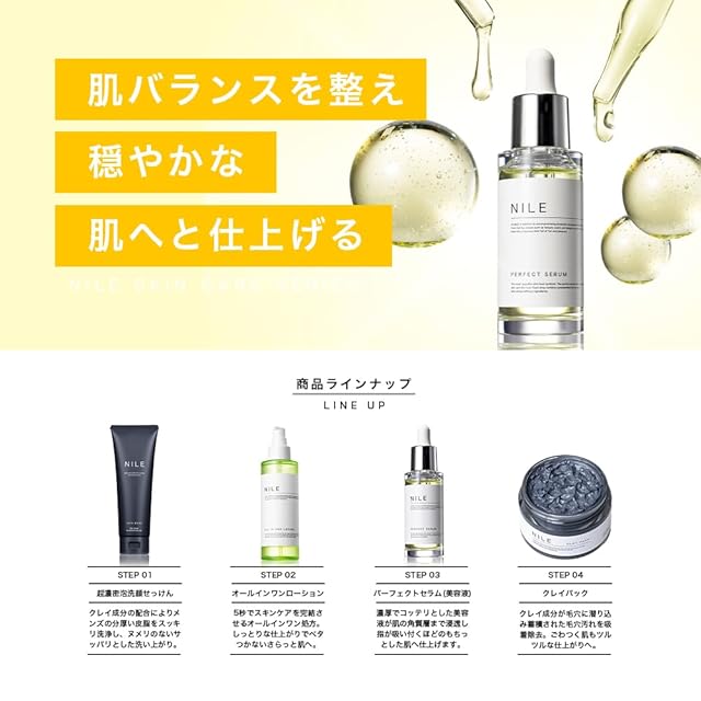 【濃厚な1滴】敏感肌・乾燥肌・荒れた肌・くすんだ肌・日焼け後の肌にハリと弾力をもたらす、NILEパーフェクトセラム。 豊富な美容成分をギュッと濃縮し1滴に込めた美容液です。