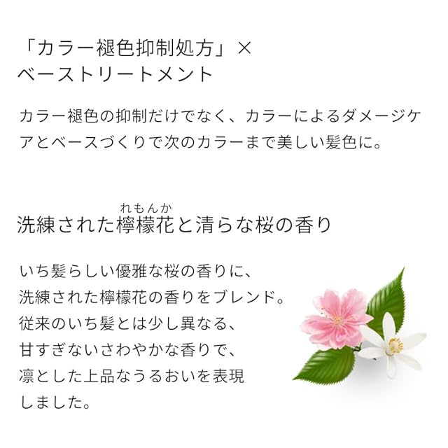 【香り】洗練された檸檬花と清らかな桜の香り。シャンプー [三分咲きの香り] ≫ コンディショナー [七分咲きの香り] ≫ トリートメント [満開の香り]と香りが徐々に花開いていきます。