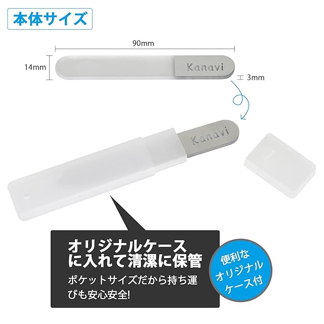 自宅で簡単にサロン級の輝きを <br><br>ネイルサロンで爪のお手入れをしてもらうとお金もかかるし、定期的に通う必要がありますよね。 <br><br>Kanaviのナノガラスシャイナーならコストパフォーマンス最高!1本あれば、自宅で簡単にサロン級の輝きを維持することができます。家族みんなで使うこともできますよ。 <br>【特徴】 <br>●マニキュアを塗ったようなようなきらきら・クリスタル光沢が出ます。 <br>●爪表面がなめらかに!爪が光を性反射し、鏡のような輝きが長持ちです。 <br>● エコで健康な素材、特殊加工ガラス製! <br>●水洗いで何度でも使用可能、半永久的に使用可能 <br>【ご使用方法】 <br>●まず爪をきれいにします。マニキュアやジェルなどを落としてからご使用ください。 <br>●本体のざらざらした面で、爪先の形をつくります。 <br>●本体のざらざらした面を爪表面に密着させて、優しく左右に動かします。 <br>●爪のカーブに対して45度の角度にすると角が立たず滑らかにできます。 <br>●削られた爪の削りかすを除去して、つるつるネイルの完成! <br>●使用後は、水洗いしてください、水洗いで何度でも使用可。 <br>●専用ケース付きなので保管しやすく、清潔で衛生的にご使用いただけます。 <br>【素材】特殊加工ガラス製 <br>【セット内容】本体+収納ケース <br>【本体重量】約9g