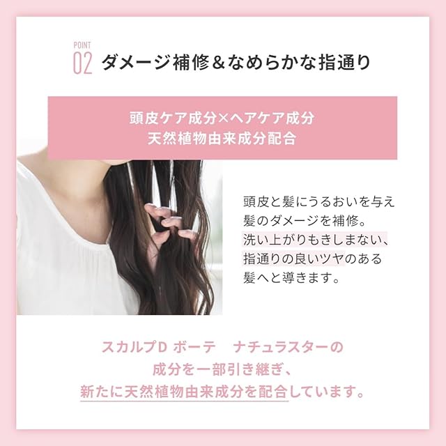 きもちまで弾む、ふわり髪へ スカルプD ボーテで始めるファーストボリュームケア 共通特長1【根元からふんわりボリューム】 ハリコシ成分コラーゲンペプチドD※ 配合。 髪をコーティングし根元の立ち上がりをサポート。 ハリコシのある髪へと導き、根元からふわっと立ち上がるスタイリングを実現。 共通特長2【ダメージ補修&なめらかな指通り】 天然植物由来成分配合。髪と頭⽪のうるおいを与え、髪のダメージを補修。 洗い上がりもきしまない、指通りの良いツヤのある髪へと導きます。 共通特長3【5つの無添加設計】 シリコン/鉱物油/合成着色料/パラベン/サルフェート(硫酸系化合物)不使用 共通特長4【リラックス感のあるアロマティックカシスの香り】 ▼スカルプシャンプー 【摩擦を抑えてやさしく洗う】 アミノ酸系の洗浄成分配合。弱酸性の濃密ふわもち泡。 うるおいを保ちながら毛穴汚れ・ベタつきをしっかり落とします。 女性の頭皮トラブル「乾燥」「フケ・かゆみ」「ベタつき」「ニオイ」にアプローチ。 ▼トリートメントパック 【頭皮も髪もダブルでうるおす】 頭皮にもつけられるトリートメントパックで頭皮と髪をダブルで保湿ケア。 頭皮にうるおいを与え健やかな頭皮環境を保ちます。 ※加水分解コラーゲン、パルミトイルペンタペプチド-4、オリーブ油脂肪酸セテアリル、オリーブ油脂肪酸ソルビタン、ポリクオタニウム-10