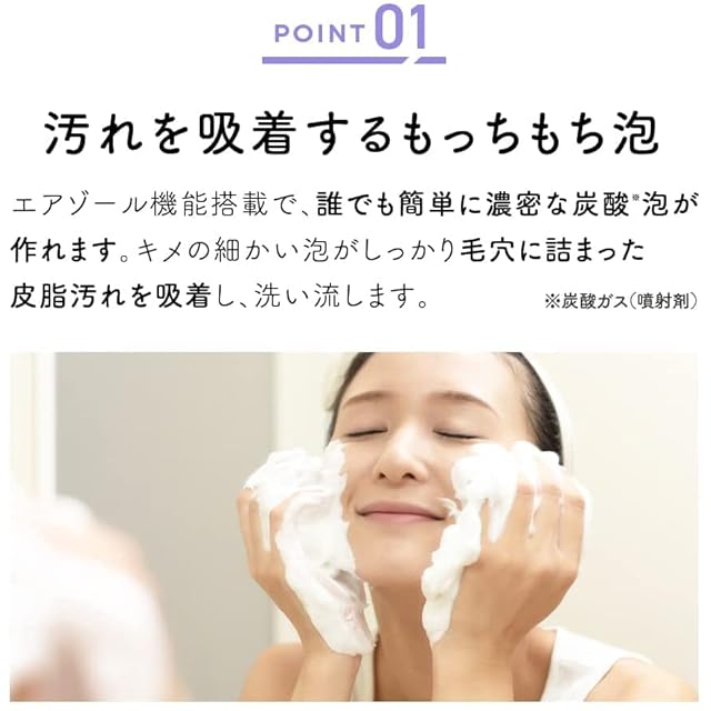 【汚れを吸着するもっちもち炭酸泡】 エアゾール機能搭載で、誰でも簡単に濃密な炭酸※泡が作れます。キメの細かい泡が毛穴に詰まった皮脂汚れを吸着し、しっかり洗い流します。