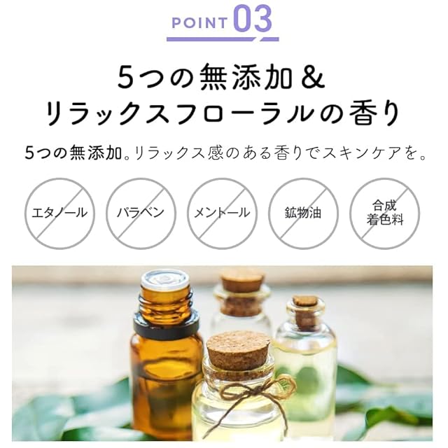 【5つの無添加設計】 エタノール、パラベン、メントール、鉱物油、合成着色料の5つを使用しない無添加設計。リラックス感のある香りでスキンケアを。
