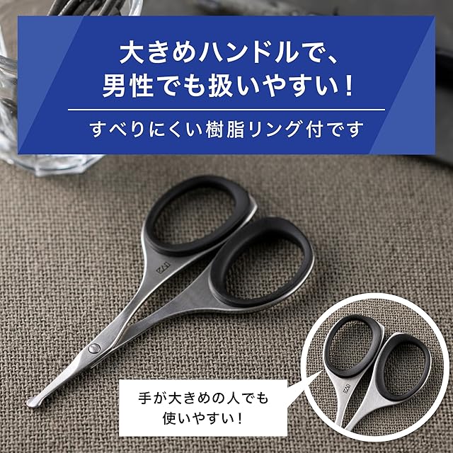 男性向けの指穴サイズで、すべりにくい樹脂リングを装着したオール金属の鼻毛用ハサミです。