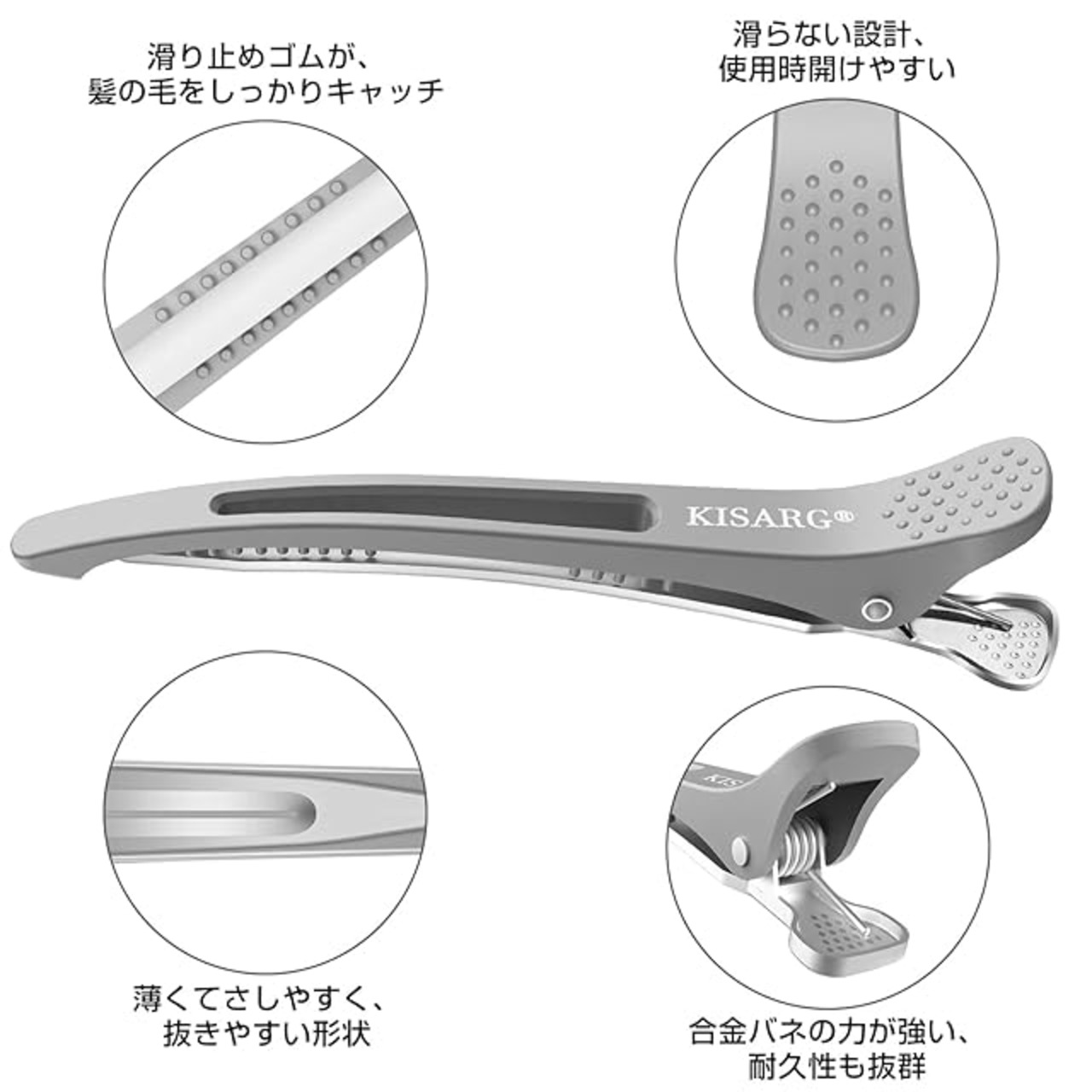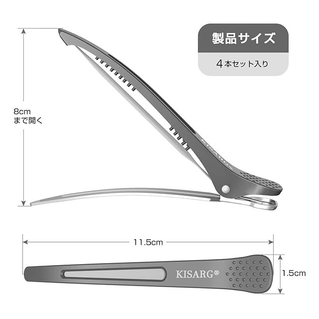 商品名:KISARG ダッカール ヘアクリップ ヘアピン ダックカール 髪留め 前髪 クリップ ブロッキング メンズ 美容師 プロ用 跡がつかない ピン 大きめ 4本入り 11.5cm グレー