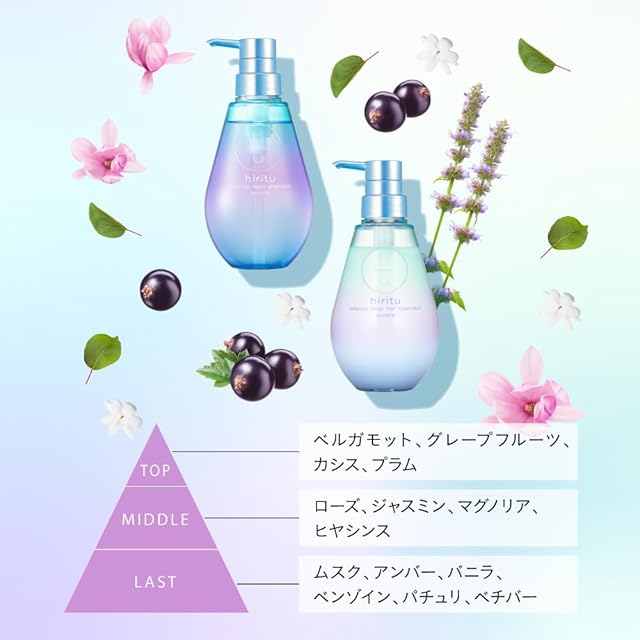 光の反射を整え思わず見惚れるまばゆ髪へ。 内側からツヤを生み出すリフレクションコントロール処方で、まばゆい光を放つなめらかな髪へ導きます。 さらに、髪の光沢感を高めプレミアムなツヤを叶えるダイヤモンドリッチ成分を配合。PPT系×アミノ酸系洗浄成分を採用し、ダメージを受けた髪を補修しながらやさしく洗い上げるシャンプーと、hiritu独自のバランスケア処方で、ダメージヘアを徹底補修し、ツヤを阻む浮き毛を抑制するヘアトリートメントです。 香水のような高級感あふれる凛として印象的なカシス&パチュリの香り。 hirituは、髪の黄金比率に着目し、髪に必要なたんぱく質・水分・油分をバランスよく補い、髪内部からダメージを補修。 独自のバランスケア処方で「プレミアムなツヤ」×「浮き毛抑制」を叶え、まばゆい光を放つなめらかな髪へ導きます。