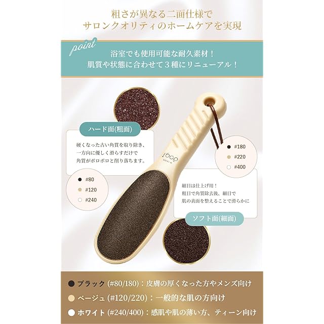 【簡単 2 ステップできめ細かな肌へ】#120 の粗い面で硬くなった角質を取り除き、#220 の 細かい面で足全体の肌をなめらかでツヤツヤに整えます。かかとの状態に合わせて 2 種類の 面を使い分けて誰でもサロンクオリティの仕上がりに。同シリーズの高保湿かかとクリー ム併用で、より「すべすべもちもちかかと」へ導きます。