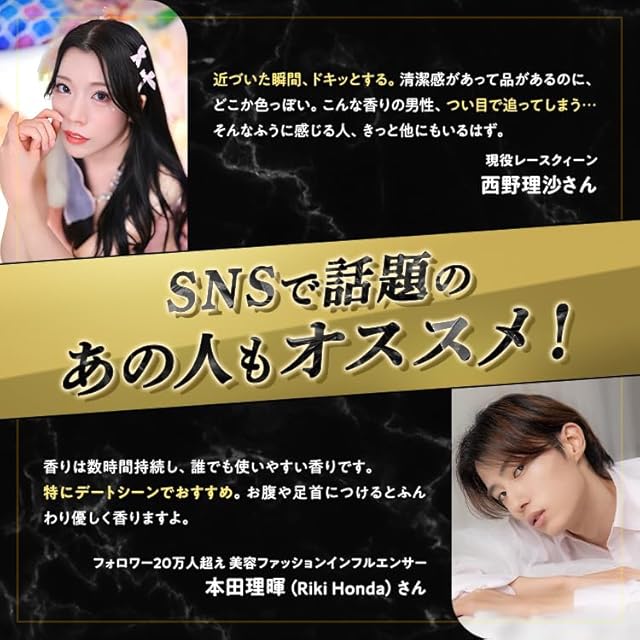 【SNSで話題!あの人もオススメ!】 「近づいた瞬間、ドキッとする。」 清潔感があるのに、どこか色っぽい。そんな香りについ目で追ってしまう。 ——現役レースクイーン 西野理沙さん 推薦! 「特にデートシーンでおすすめ」 ふんわり優しく香るから、お腹や足首につけるのが◎ ——美容ファッションインフルエンサー 本田理暉さん(フォロワー20万人超)