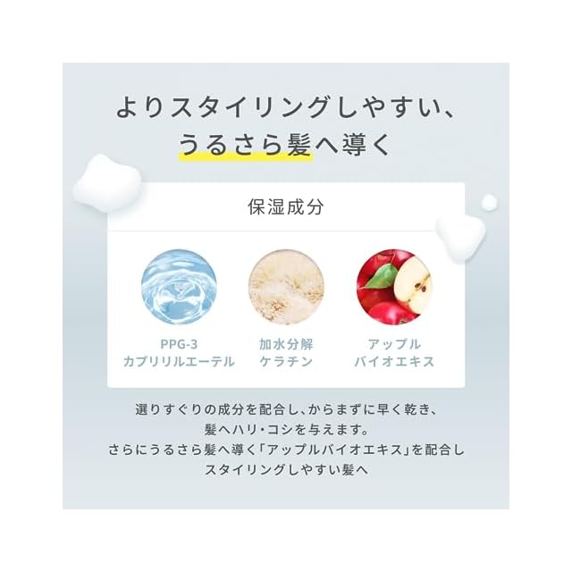 【「仕上がり」の気持ち良さ】洗い上がりの仕上がりにもポイントが。重さで“しっとりまとまる”のではなく、軽さもありながら“さらっと軽やかにまとまる”ことで、サロンで実感するような仕上がりに。