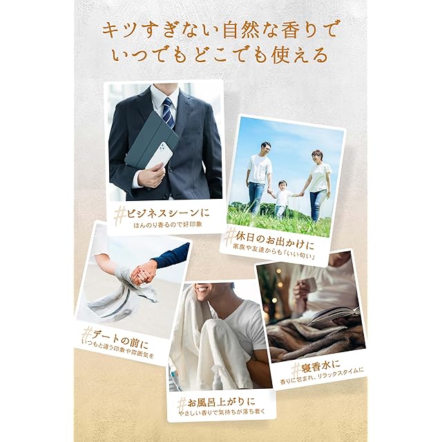【優しく華やかに香るキンモクセイの香り】■ふわっと香る甘いキンモクセイの香りをベースに、オレンジやベルガモットのような爽やかな香りをブレンドすることでメンズでも使いやすいキンモクセイに。■男性だけでなく女性からも高評価で、ビジネスシーンや家族とのお出かけ、就寝前の寝香水としてもおすすめ。ほのかに香る爽やかな香りが癒しの時間をお届けします。
