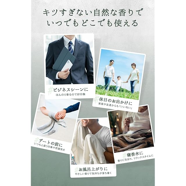 【上品で爽やかなグリーンティーの香り】■日本のグリーンティーを基調とした爽やかで上品な、どこか懐かしく雰囲気のある深い香り。男女問わず使える爽やかな香りが人気。■男性だけでなく女性からも高評価で、ビジネスシーンや家族とのお出かけ、就寝前の寝香水としてもおすすめ。ほのかに香る爽やかな香りが癒しの時間をお届けします。