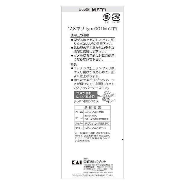 商品名:貝印 KAI 爪切り Type001 M ST 白 直線刃 日本製 KE0116