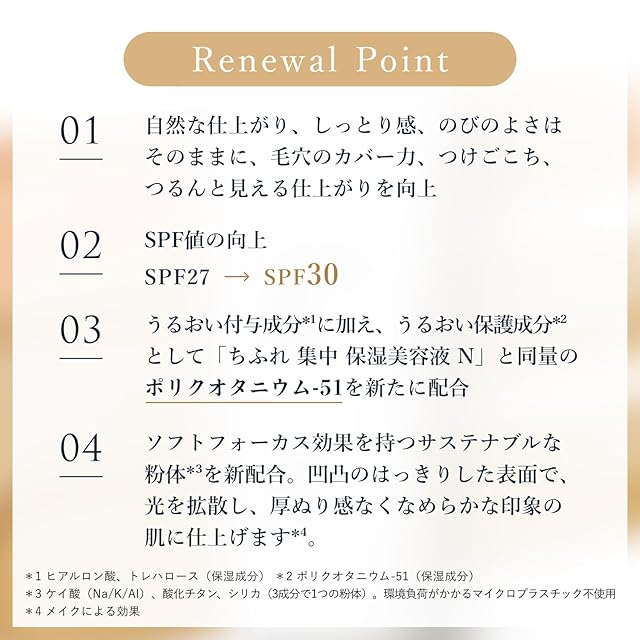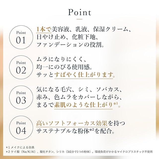 【カバー力とナチュラルな仕上がりを両立】気になる毛穴、シミ、ソバカス、赤み、色ムラをカバーしながら、まるで素肌のような自然な仕上がり*1。高いソフトフォーカス効果を持つサステナブルな粉体*2を配合し、毛穴レスなつるんとつや肌に。(*1…メイクによる効果 *2…ケイ酸(Na/K/Al)、酸化チタン、シリカ。環境負荷がかかるマイクロプラスチック不使用)