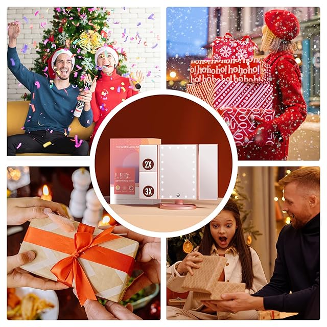 FACSINATE 女優ミラー 三面鏡 卓上鏡 化粧 ledメイク 折りたたみ ライト付き 拡大鏡 2/3倍 タッチ式 明るさ調節 角度調整 収納ペース (ローズゴールド)