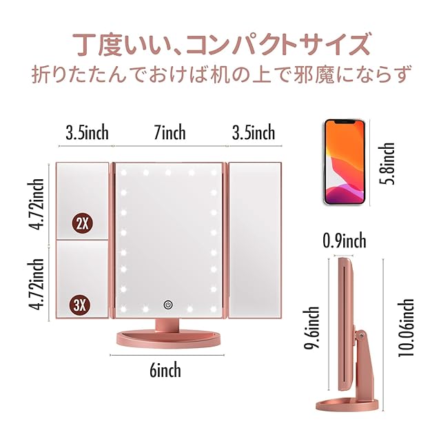 商品名:FACSINATE 女優ミラー 三面鏡 卓上鏡 化粧 ledメイク 折りたたみ ライト付き 拡大鏡 2/3倍 タッチ式 明るさ調節 角度調整 収納ペース (ローズゴールド)
