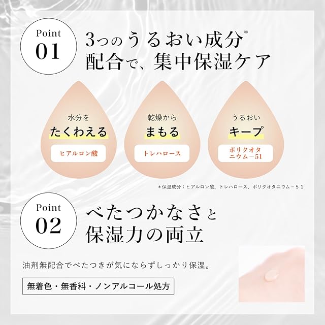 【保湿成分配合でしっとり肌に】うるおい付与成分 ヒアルロン酸・トレハロース配合で、角層の水分を補い、乾燥から守ります。うるおい保護成分 ポリクオタニウム-51配合で、うるおいをしっかりキープして、しっとりとした肌を保ちます。角層へじっくり届き、ふっくらもちもち美肌へ導きます。