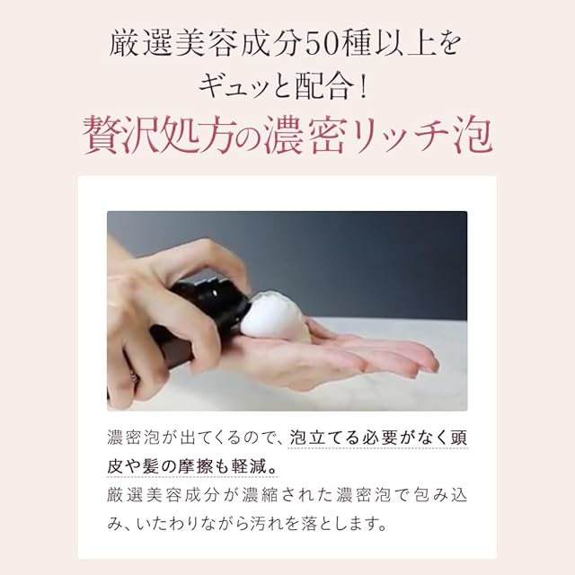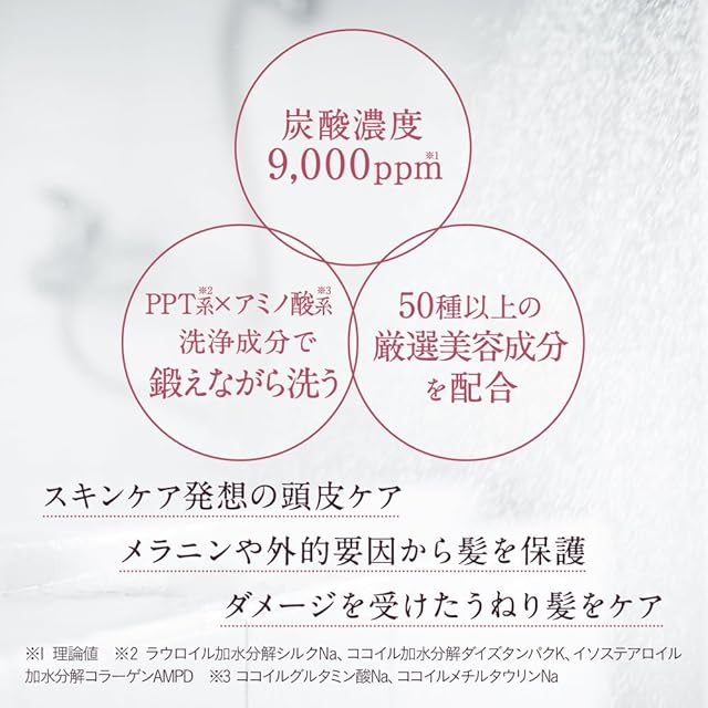 頭皮から美髪を育む、3日に1度のご褒美シャンプー。 高濃度※1炭酸※2とPPT系※3×アミノ酸系※4洗浄成分が、頭皮と髪をクレンジング。 50種以上の厳選した美容成分で頭皮や髪のあらゆるお悩みを自宅で簡単にケアできる濃密泡タイプのノンシリコンシャンプーです。 普段お使いのシャンプーの代わりに使用いただくだけの、今までのヘアケアに満足できなかった方のための次世代スペシャルホームケアアイテムです。 ※1 自社従来品比較 ※2 炭酸(噴射剤として) ※3 ラウロイル加水分解シルクNa、ココイル加水分解ダイズタンパクK、イソステアロイル加水分解コラーゲンAMPD ※4 ココイルグルタミン酸Na、ココイルメチルタウリンNa