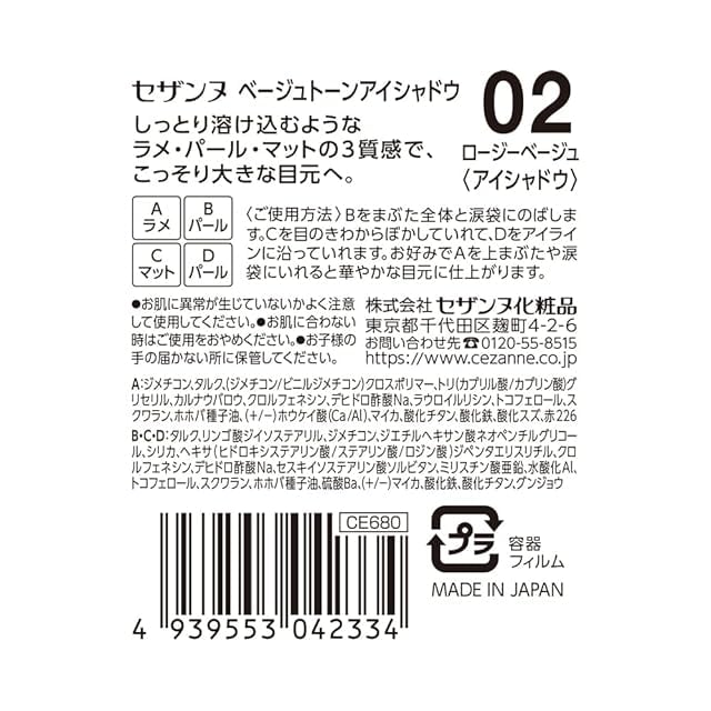 商品名:セザンヌ ベージュトーンアイシャドウ 02 ロージーベージュ 4.3g ラメ パール マット 4色アイシャドウ