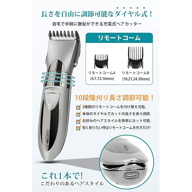 商品名:電動バリカン ヘアーカッター バリカン メンズ IPX7防水 ヘアクリッパー Type-c 充電式 リミットコーム付きで 10段階調節可能 散髪用 ショートヘア用 子供用 家庭/業務用 取り外し可 水洗い可 プロ仕様 日本語説明書付き