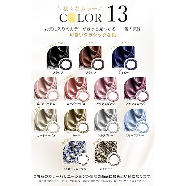 【カラー展開・選べるセット】豊富なカラー展開には、ブラック、ブラウン、ネイビー、ピンクベージュ、ローズベージュ、アッシュピンク、アッシュローズ、カーキベージュ、カーキ、シルクグレー、スモークブルー、ネイビーフローラル、レオパードが含まれています。2本セットと3本セットのオプションがあり、日々のスタイリングを華やかに彩ります