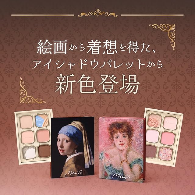 【ミルフィー】絵画からインスピレーションを得た アイシャドウパレット。 肌に溶け込むようになじむ、 軽いつけ心地の柔らかいパウダーで 瞳に芸術を落とし込みます。