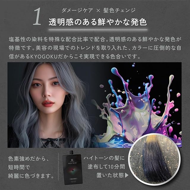 ✨【KYOGOKUカラーセラム:ダークアッシュの特徴】KYOGOKUカラーセラムは、ダメージケアをしながらトリートメント感覚で髪の毛に補色(カラーケア)ができます。塩基性の染料を使用しており、HC染料とイオン結合をすることで髪の毛の表面に色素をコーティングします。そのため髪の毛へのダメージがないと言っても過言ではない状態でカラーチェンジをすることができます。元の髪色がハイトーン(白に近い色)ほどカラーセラムそのままの発色が実現できます。元の髪色により発色は異なりますが、ブリーチをしていない髪の毛にもご使用いただけます。KYOGOKUカラーセラムのダークアッシュは、白髪を染めることができます。