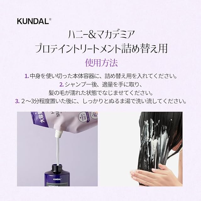 ”あなたのお風呂時間をもっと楽しく。” KUNDALの代表ヘアケアライン「ハニー&マカダミア」の詰め替えセット 頭皮の汚れや角質をスッキリ洗浄。 植物由来抽出物で髪の毛の根元から先までしっとりケア。 香水並みのフレグランスのクオリティー KUNDALの専門調香師が開発した多彩で豊かな香り展開 敏感な頭皮でも使いやすいファミリーヘアケア製品 NOシリコン、NOアルコール