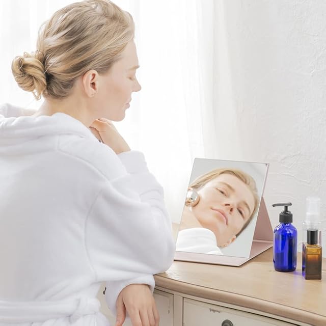 【軽量コンパクト・角度調整可能】お好きな角度でメイクが出来るように角度調整可能なロックラインが付いています。また、ミラーの裏面には滑り止め防止のクッションゴムも付いています。収納時は軽量でコンパクトなので、引き出しやバッグに入れても邪魔になりません。旅行やお出かけ時など持ち運びに便利です。カバーはクッション素材でバッグに入れても割れにくくなっています。サイズ17.5cm×22.5cm、厚み1.5cm、重量約360g