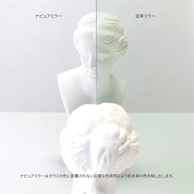 【正しい肌色を映し出す特許のミラー】ナピュアミラーは、くすみの原因となる鉄分をより多く取り除いた透明度の高いガラスと、色の再現性が高い反射金属との組み合わせにより、本来の姿をありのままに映し出す特許を取得したミラーです。(特許番号:PAT3732490) 肌の色が鮮明に映ることで、自分に合ったファンデーションの色味がわかり、メイクの仕上がりが格段よくなるため、美容業界のプロの方々にも支持されています。また有害な鉛成分を全く含まない、人と環境にやさしいミラーです。