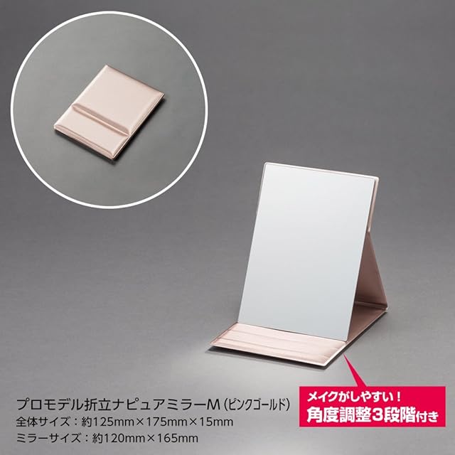 【メイクアップアーチストが愛用】プロモデル折立ミラーは美容部員やメイクアップアーチストが愛用するモデル。ミラーに無駄なフレームを無くすことで商品サイズに対して最大の有効ミラーサイズを実現。とにかく広くて見やすいので快適にメイクが出来ます。使い終われば1.5センチの厚みになりコンパクトに収納が出来て持ち運びに便利です。