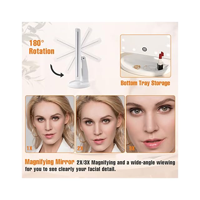 <b>FASCINATEのライト付きバニティミラーで、あなたの美しさと自信を見出してください。</b><br><br><b>3つ折りミラーの特徴:</b><br>1. 明るい21個の自然な光のLEDライト。<br>2. 明るさを調節できるタッチセンサースイッチ内蔵。<br>3. 3倍/2倍/等倍のミラー。<br>4. 180度自由に動かせます。<br>5. USB充電(付属)と単4電池4個 (別売り)で使えます。 <br>6. 3つ折りのポータブルデザインは持ち運ぶのに便利です。<br>7. 収納機能付きのベース部分は、スペースの節約になると同時に、ドレッサーをきれいに整頓できます。 <br>8. 女性や女の子へのプレゼントに。ハロウィン、クリスマス、新年、バレンタインデー、母の日、誕生日、パーティー、発表会、特別な日のプレゼントに最適です。</b><br><br><b>仕様:</b><br>* 色: ホワイト。<br>* フレーム素材: ABS樹脂。<br>* 製品サイズ: 10.8×7.0×4.7インチ。<br>* 中央部ミラーの寸法: 9.5×7インチ。<br>* 両方のサイドのミラーの寸法: 9.5×3.2インチ。<br>* 総重量:0.8kg<br>*LEDライト: 21個のLED。<br>*LEDコントロール: タッチスクリーンのオン/オフ。<br><br><b>商品内容:</b><br>LED付きメイクアップミラー x 1。<br>10倍の拡大鏡 x 1。<br>USBケーブル x 1。<br>取扱説明書 x 1 (日本語ではない場合があります)。<br><br><b>使い方:</b><br> ステップ1: 単4電池4本 (別売り) を入れるか、USBケーブルをUSBポートにしっかりと差し込みます。 ケーブルをつなげた後に、2つの電源ボタンをオンにします。 <br>ステップ2 : まず、ミラーの背面にある黒いスイッチ(メインスイッチ)をオンにしてください。 次に、センサースイッチ (大きな円) を指でタッチすると、ミラーが点灯します。 <br>ステップ3: センサースイッチを3秒間タッチすると、ライトの明るさが徐々に変化します。 ご希望の明るさになったら指を離します。 <br><br><b>ご注意:</b><br>1. このライトアップミラー本体に充電することはできません。 <br>2. センサースイッチにタッチしてライトを点灯する前に、ライト付きミラー裏面のON/OFFボタンがONになっていることを確かめてください。