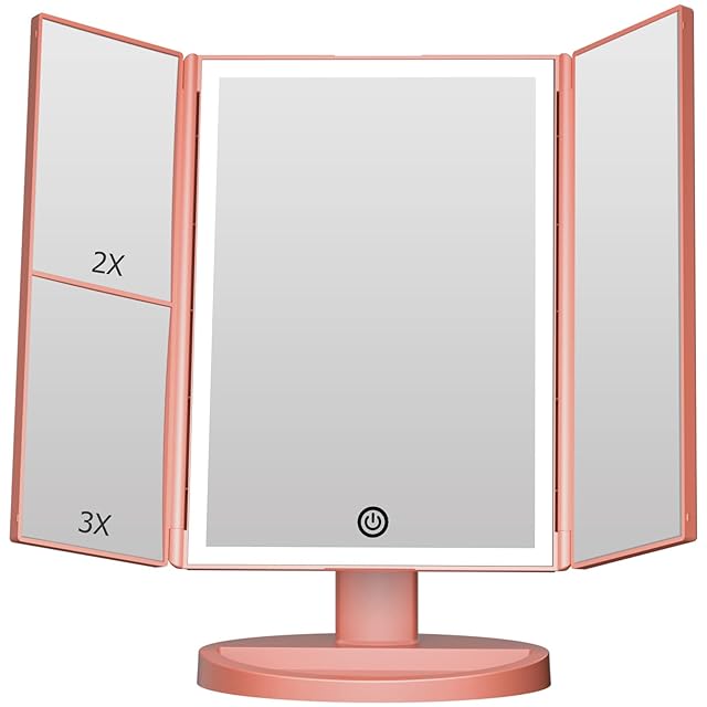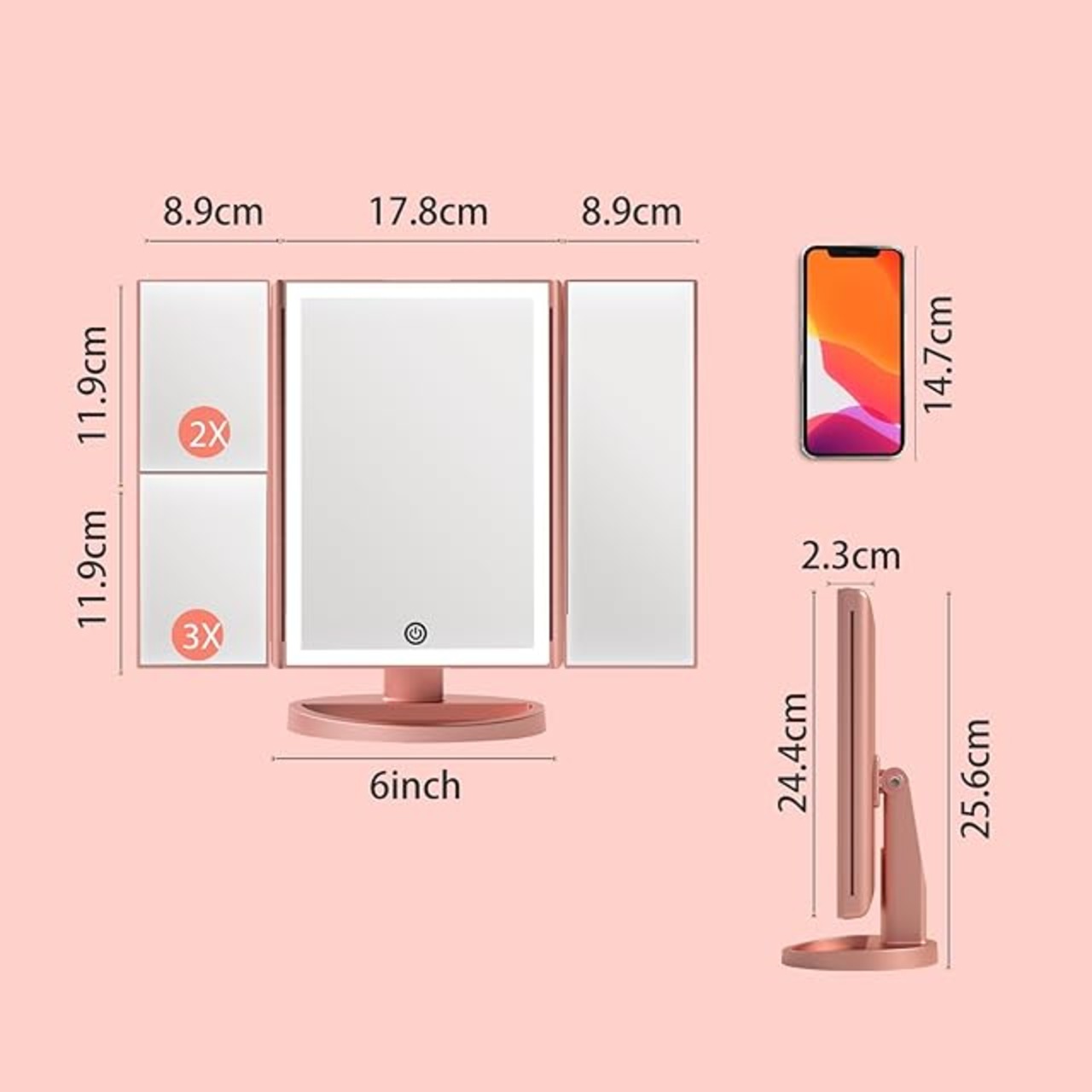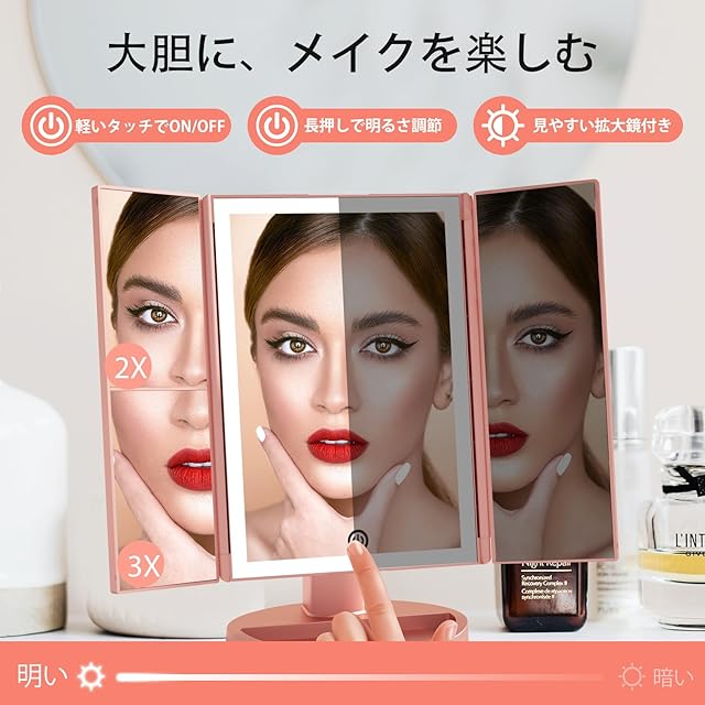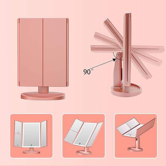 FACSINATE 女優ミラー 三面鏡 卓上鏡 化粧 ledメイク 折りたたみ ライト付き 拡大鏡 2/3倍 タッチ式 明るさ調節 角度調整 収納ペース (ローズゴールド(テープライト版))