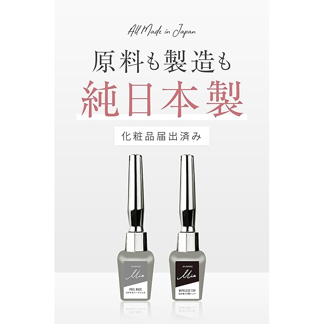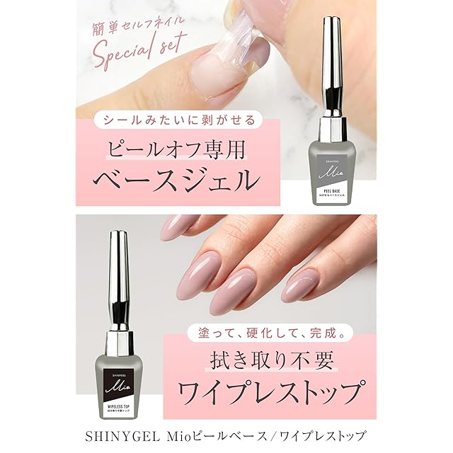 商品名:SHINYGEL Mio シャイニージェル ミオ 【ピールベース+ワイプレストップ】各5g <剥がせるベースジェル&拭き取り不要トップ> 日本製 爪に優しい UV/LED対応 ピールオフベース ノンワイプ トップ ジェル リムーバー不要 はがせる 簡単オフ