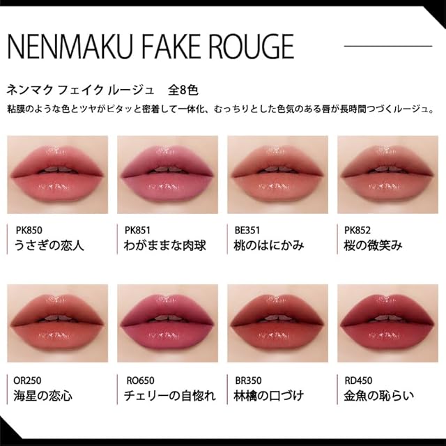 粘膜カラーを再現した肌なじみのよいカラーラインアップ。じんわりとした血色感と適度なツヤ感で、どんな方にもなじみやすいのが魅力です。