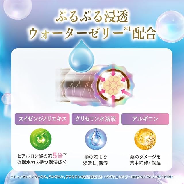 ✨【配合成分】髪内部にとどまる、ぷるぷる浸透ウォーターゼリー*²配合。 *² スイゼンジノリエキス、アルギニン、グリセリン水溶液:保湿成分