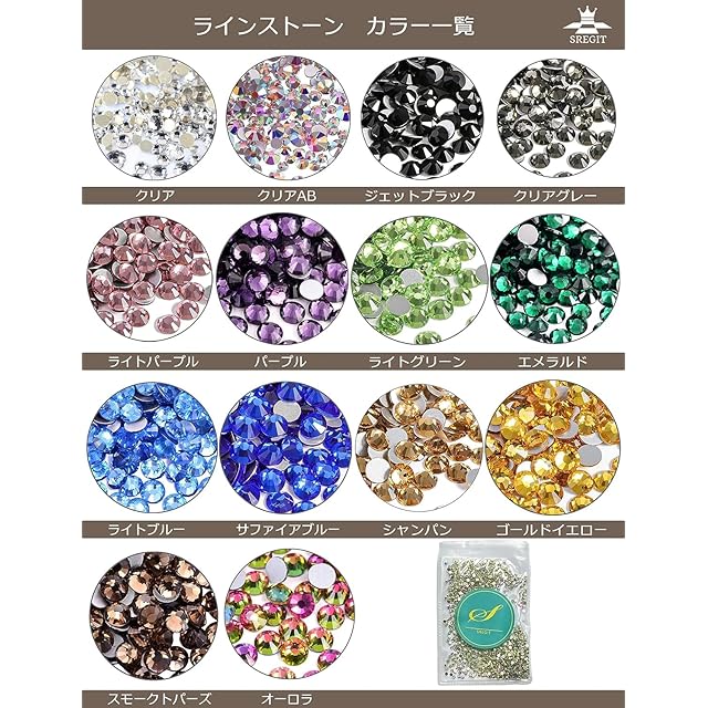 【内容量】:ラインストーン/1カラー・1サイズ(計1300粒以上)【カラー】 クリア / クリアAB / ジェットブラック / クリアグレー / ライトパープル / パープル / ライトグリーン / エメラルド / ライトブルー / サファイアブルー / シャンパン / ゴールドイエロー / スモークトパーズ / オーロラ