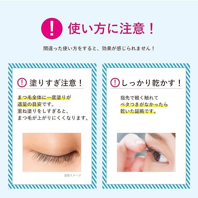 使用方法: ①まつ毛全体に本品を1度塗り ※塗布量が多いとまつ毛が上がりにくくなります。 ②しっかり乾かす ※指先で軽く触れてベタつきがなかったら乾いた証拠です。(30秒程度が目安です。) ③ビューラーでまつ毛を上げる その後マスカラ等普段通りのメイクをしてください。