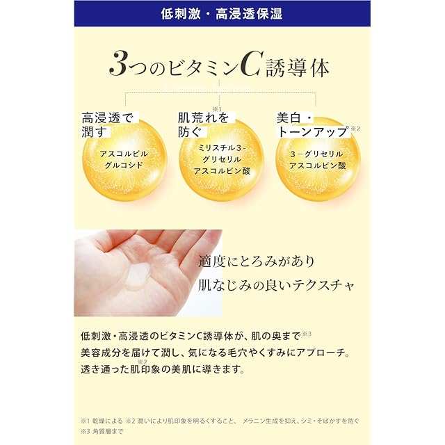 ✅ 3種のビタミンC誘導体(アスコルビルグルコシド、ミスリチル3-グリセリルアスコルビン酸、3-グリセリルアスコルビン酸)を贅沢配合。くすみ※を防ぎ、明るい印象の肌へ(※乾燥による)。