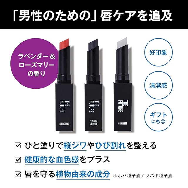 【TikTokフォロワー290万人超!】Z世代のスター「りゅうと」とメンズコスメブランド「THE FUTURE」のコラボが実現。メンズ視点でこだわり抜いた、「顔印象を決める」リップクリーム。 【特徴】ひと塗りで縦ジワやひび割れを整え、健康的な血色感をプラス。マスクを外した時こそ目がいく口元をケアすることで、一気に印象アップが叶う。 【こんな方におすすめ】メリハリのある顔立ちになりたい方/顔色の悪さが気になる方/唇が乾燥しやすい方/人前に立つ機会が多い方 【成分】肌や髪にも使われる「ホホバ種子油」や「ツバキ種子油」など、唇を守る植物由来の成分をたっぷり配合。 【使い方】身だしなみの最後や、乾燥が気になるときにくり出して使用してください。 【デザイン】ポケットにサッと入れられる細身のデザイン。洗練された雰囲気で、ギフトにも◎。