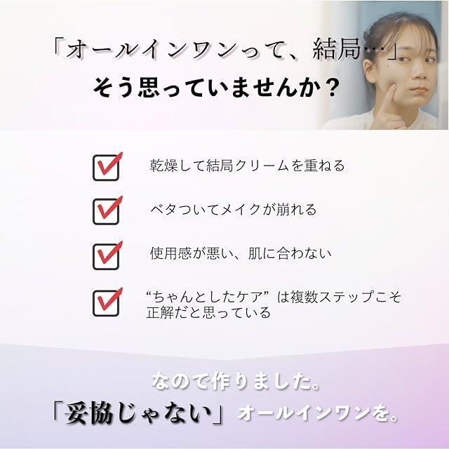 オールインワンは妥協? そのイメージを覆すかのように。 『妥協したくないあなたへ贈るオールインワン』 みずみずしくなめらかなジェルが 肌の上でとろけて馴染む オールインワンのクリーム。 うるおいを与え、 キメの整った輝くようなツヤ肌へと導きます。