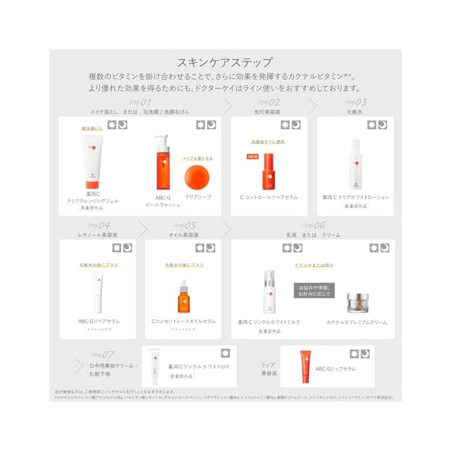 *1 ビタミンA:パルミチン酸レチノール、ビタミンB群:リボフラビン酪酸、ナイアシンアミド、パントテン酸Ca、トリスヘキシルデカン酸ピリドキシン、シアノコバラミン、ビタミンC:テトラヘキシルデカン酸アスコルビル、リン酸アスコルビルMg、ビタミンE:トコフェロール、ビタミンH:ビオチン、ビタミンP:グルコシルヘスペリジン(製品の抗酸化成分) *2 保湿成分 *3 セラミドAG、セラミドAP、セラミドEOP、セラミドNG、セラミドNP(保湿成分) *4 ヒアルロン酸Na、加水分解ヒアルロン酸(保湿成分) *5 パルミトイルトリペプチド-1(保湿成分) *6 整肌成分 *7 保湿ケアによる