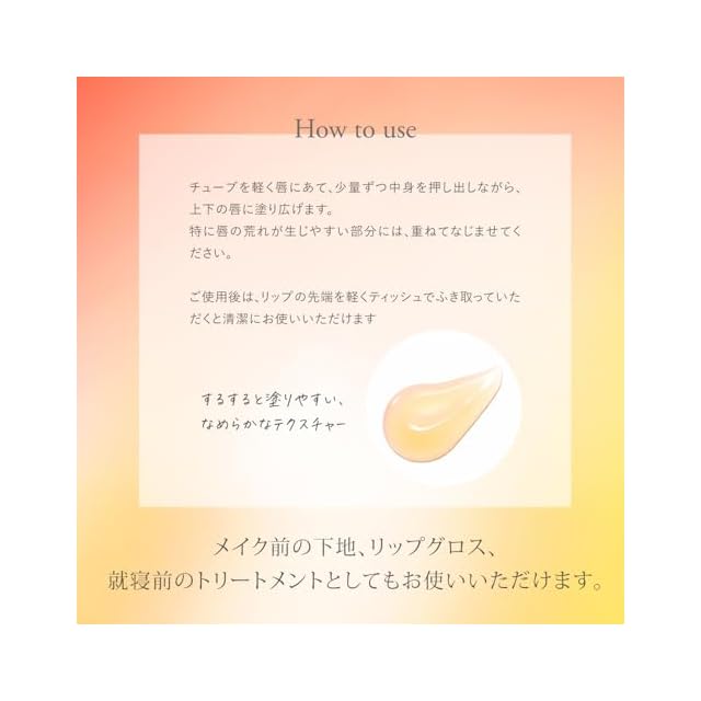 メイク前の下地、リップグロス、就寝前のトリートメントとしてもお使いいただけます。