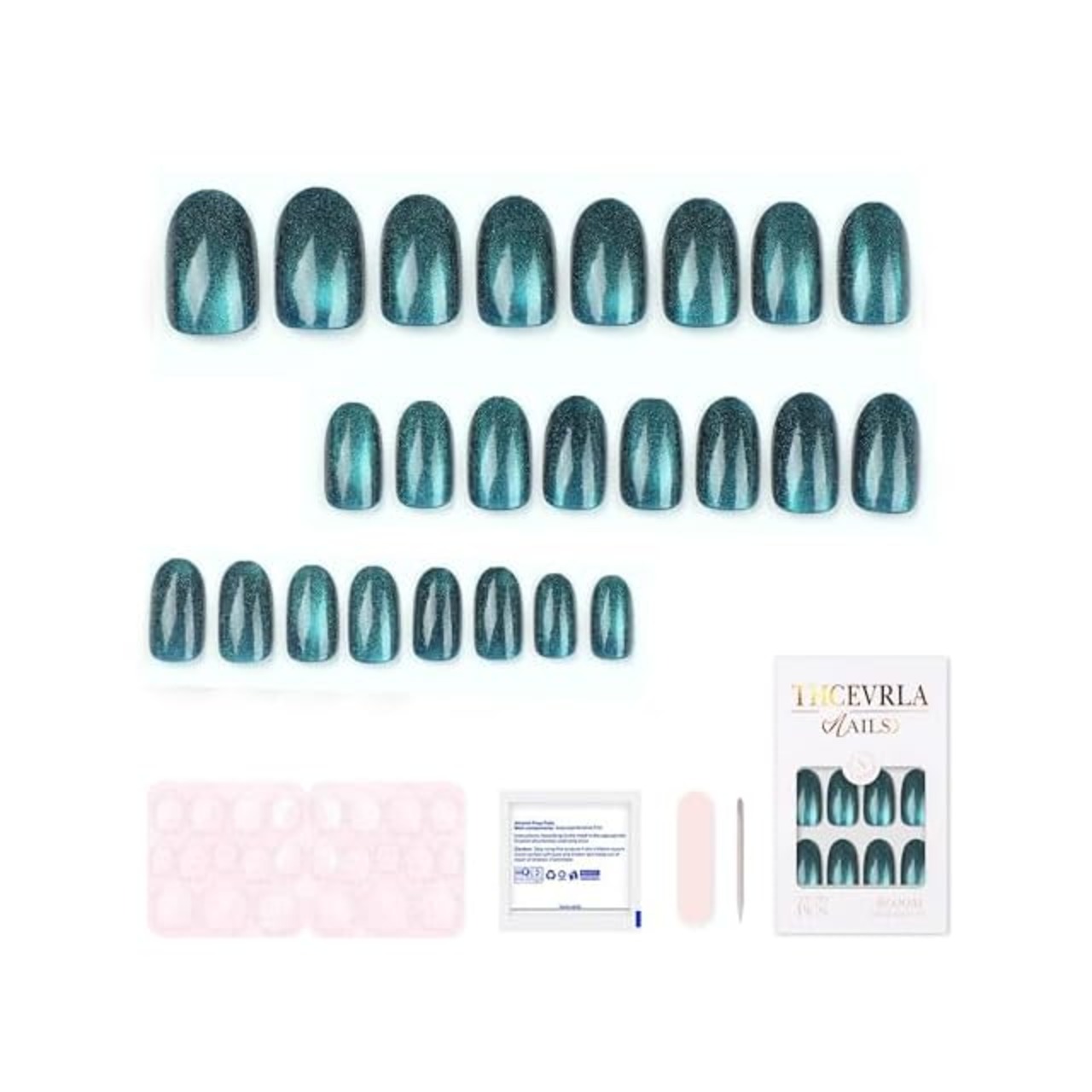 THCEVRLA ネイルチップ - 青 オーバル 手作りネイルチップ ショートク,キャッツアイ マグネット おしゃれ 付け爪ゲル化,ツールキットが付属しています,24枚入