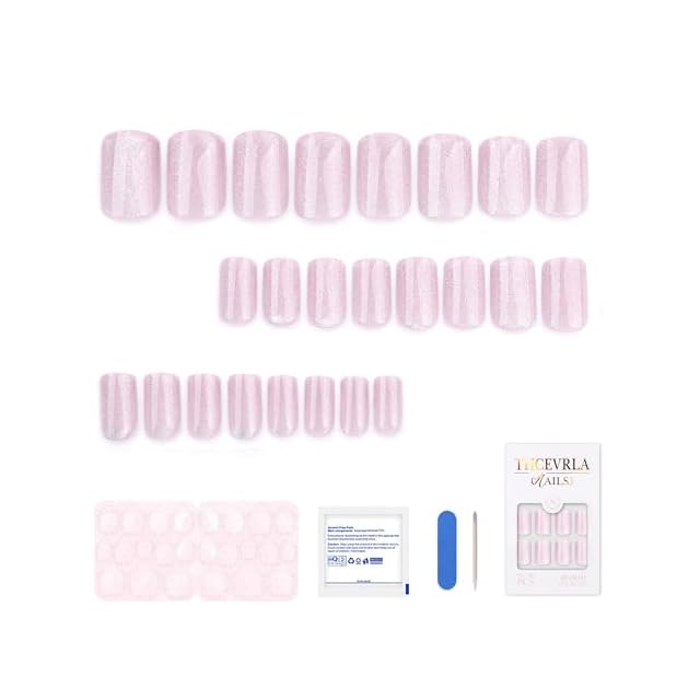 THCEVRLA ネイルチップ - ピンク 四角 手作りネイルチップ ショートク,キャッツアイ マグネット おしゃれ 付け爪ゲル化,ツールキットが付属しています,24枚入