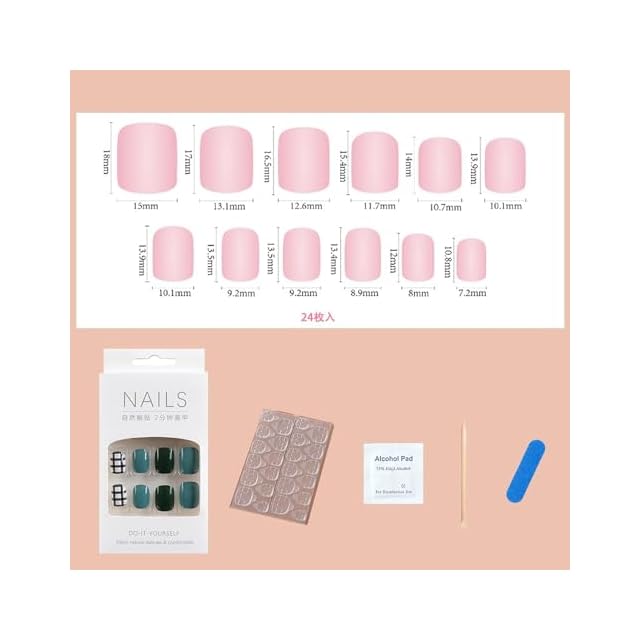 【リッチセット内容】この商品には24枚のセットが含まれており、予備用のネイルチップも一緒に提供されます。さらに、両面テープや爪やすり、木の棒もセットに含まれています。到着後すぐに使用できるので、お客様に便利です。さらに、両面テープに2秒間熱風をあてると、さらにしっかりと貼り付けることができます。