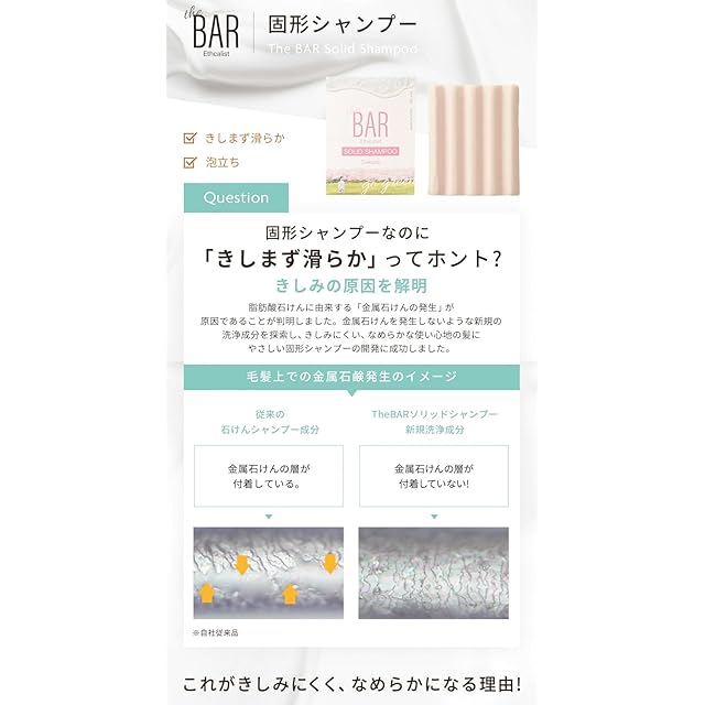 当製品は、固形石鹸にヘアケア成分が配合されている"石鹸シャンプー "に対して、液体シャンプーを固形化したヘアケア成分が豊富に含まれている、きしみやごわつきの少ない"固形シャンプー"です。液体から水分を抜くことで機能成分が濃密に残り、少ない量でもよく泡立ち、滑らかな洗い心地と仕上がりを実現しています。