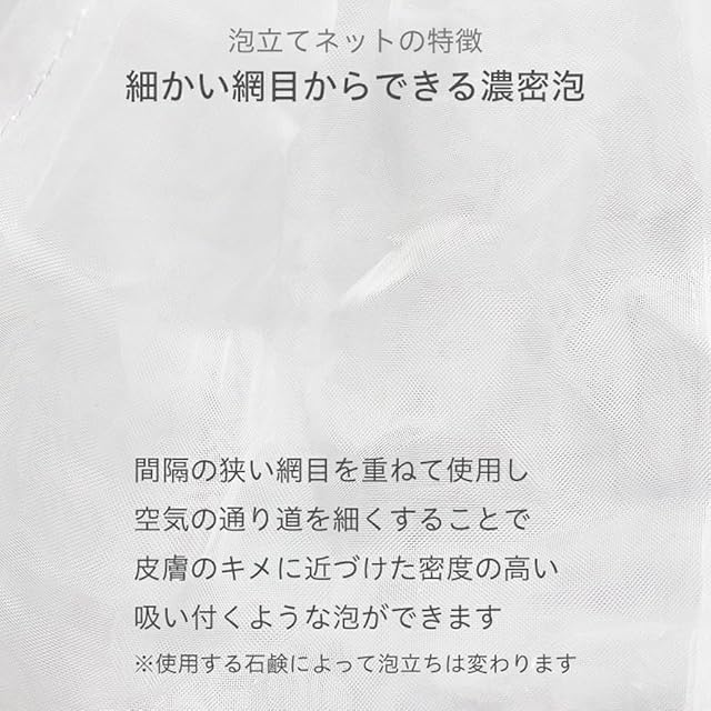 【とうもろこし由来のポリ乳酸繊維を使用した泡立てネット付き】間隔の狭い網目を重ねて使用し、皮膚のキメに近づけた密度の高い泡ができます。ポリ乳酸繊維は植物由来原料のためCO2排出量が少ない、燃焼熱が低く有毒ガスを排出しない、土中で生分解されるという特徴でサスティナブル社会実現に貢献できる材料として期待されています。