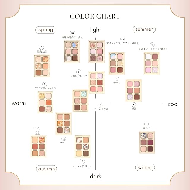 【絵画アイシャドウ】絵画からインスピレーションを得たアイシャドウパレット。 肌に溶け込むようになじむ、 軽いつけ心地の柔らかいパウダーで瞳に芸術を落とし込む。